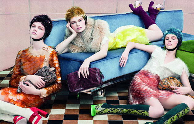 We also love the Prada Autumn Winter campaign, photographed by Steven Meisel, but are disappointed that they have used seventeen year olds to advertise a range which is essentially targeted at wealthy older women. How many 20 something do you know that can afford to buy a pair of shoes for £300? Beautiful as they look, these girls have the faces of children and do not make us want to buy the clothes.