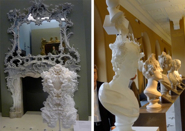This year, it’s ALL about 3D printing and the mind boggling stuff that you can get up to with it. Once you have a 3D printer (wouldn’t you love one at home? you could redesign all your furniture) you can produce incredibly complicated stuff really easily, including this complex dress (below left) designed by Murray Moss which looks like like origami on speed and the 3D reproduction of a sculpture of Lady Belhaven, (below right) sitting alongside more traditional marble versions in the sculpture hall, which has a 3D hat designed by milliner Stephen Jones. Below further there’s a set of three collapsable stools and n intricate top, all 3D printed.