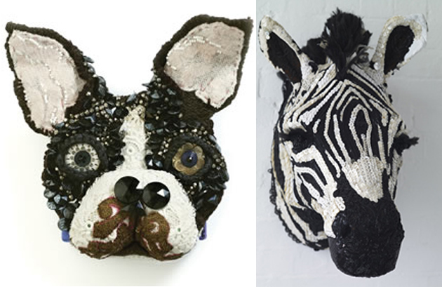 Fascinated by dogs, Donya is interested in their loyalty and the folklore that surrounds them, and has created mounted dogs heads and banners featuring different breeds. She has also made other animals such as zebras and magpies and each piece is totally unique.