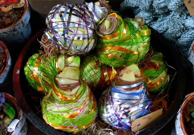 I was in Amsterdam last week for a flying visit and spotted these lovely Christmas-wrapped amaryllis bulbs. Now, the Dutch know a thing or two about bulbs, as we all know, but I think this is the first time I’ve ever seen such a creatively presented bulb, what with all that ribbon wrapping.