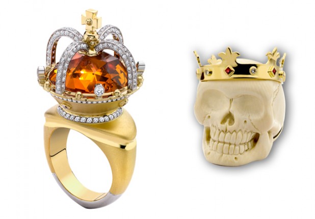 A few years ago I wrote a feature on Theo Fennel’s Show Off! show, a week long gallery-show with amazingly lovely displays by Chameleon Visuals. Since then I have received its Christmas Catalogue, obviously under the mistaken idea that I might be a customer. It’s a lovely read. The thick pages of the booklet are heavy with gigantic, rock star sized gems that are set into truly massive jewellery that you’d need to wear with the matching lifestyle, otherwise it just wouldn’t work. To carry off the citrine and diamond coronet ring (above left) you’d need a good deal of space around you to avoid damaging anyone and possibly support for your fingers. The company does do small, discrete jewellery, but where’s the fun in that? I’m thinking a stonkingly large gold crowned mammoth skull ring (made from real mammoth bone, honestly, check the website!) and Keith Richards for company. Elizabeth Taylor’s jewellery sale this week had ten pieces of Theo Fennell in it, just sayin’.