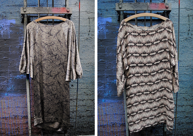 Rutzou branch print silk dress left, Baum Und Pferdgarten digital print dress right
