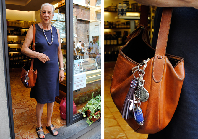 I can’t begin to tell you how utterly GORGEOUS this local Lucca lady (above) appeared, She is the ultimate in italian grooming; sleeked back short silver hair (good cut), vermillion lipstick (matching nails), neat navy Lacoste jersey sundress and a well loved leather handbag that shrieked quality (in a quiet, italian way). The addition of those creatively quirky but expensive -looking danglies on the zip chain keeps the whole look from being too boringly classic. Masterclass in chic.