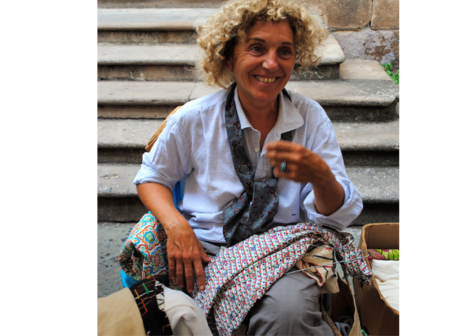 Above is my favourite vintage clothing stall holder (I want hair like that in another life please), where I bought too many silk scarves and a vintage silk shirt that was pure Marni. I love how she’s added a bit of geometric print and colour to her look with a man’s silk cravat over her fine cotton shirt, also she’s wearing mens-style grey cotton trousers that she has belted.