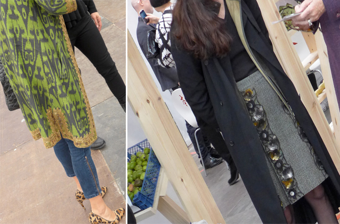 These two tartan skirts looked super-chic, particuarly the one on the right, which had a scarf to match, can you see where the scarf and skirt patterns change in the same place? I can’t imagine this working in a busy life way, but it looked fabulous here. And I love the patterned tights again…Art ladies love a textured tight it seems.