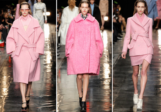Oversize coats were another key trend from the shows, along with vintage blanket/teddy bear/nan fabrics. Combine an over-sized shape and a nan fabric in sugary pink and you have the coat of dreams – as seen at the Carven show (above middle) and Jonathan Saunders (below right).