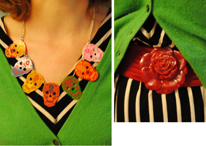 As well as a cute Gudrun black and white stripe dress topped off with an apple green cashmere cardigan, Alys was wearing a Tatty Devine Day of the Dead necklace and a vintage rose belt picked up in New York, so she’s clearly a girl with a sense of style… We had to ask – Alys what do you wear gardening?