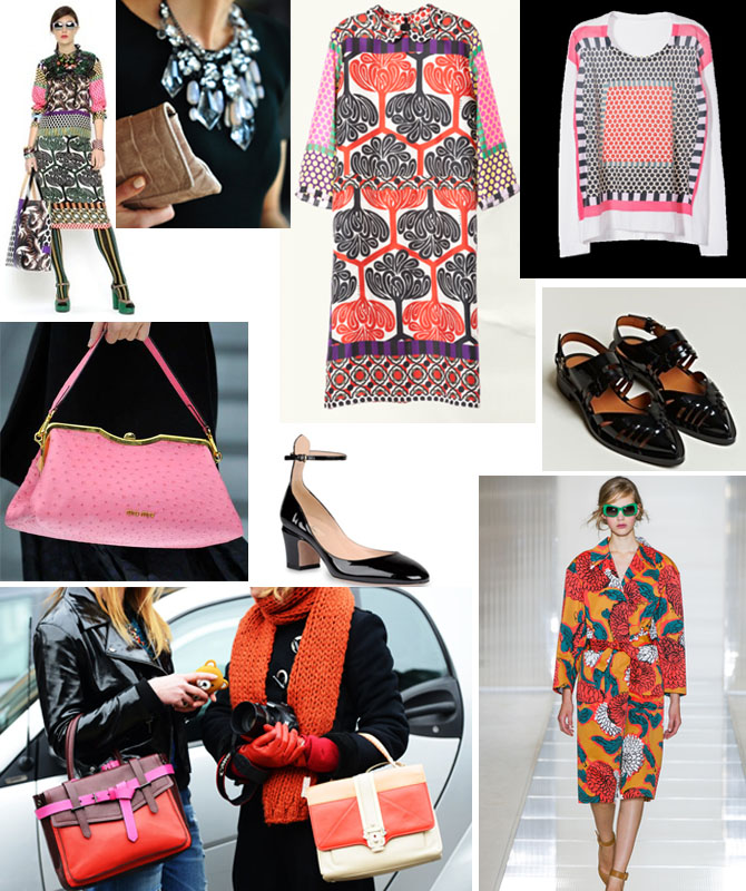 Flat or mid height shoes, colour blocked or one colour bags and OTT costume jewellery complete the look.