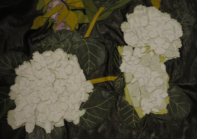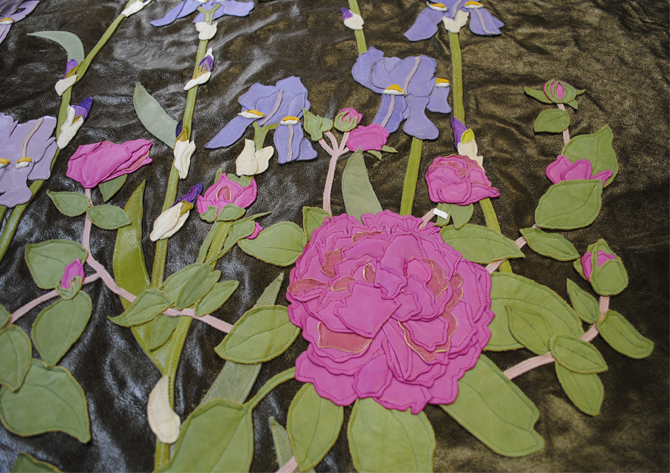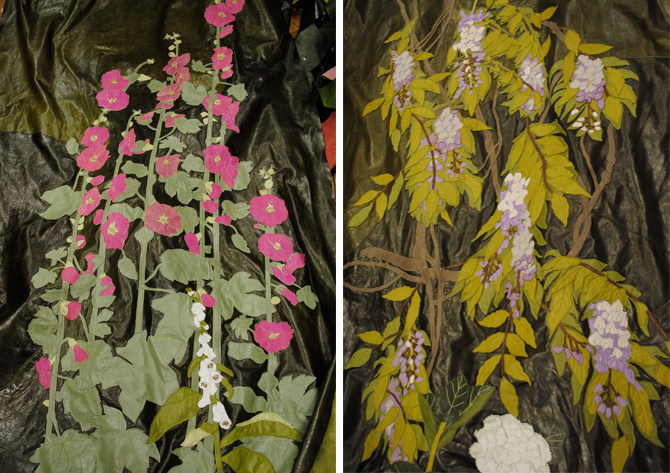 Above are hollyhocks, foxgloves and ferns, all stitched carefully onto the long leather panels which will hang along the perimeter of the garden.