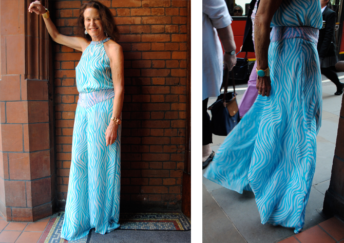 Kaftans are a great trans-generation style and good on all shapes of body. Anyone who thinks they are too casual for everyday wear just needs to add a few more necklaces and scarves to the mix, possibly even heels, then you can go pretty much anywhere. The bamboo print above looks great over wide soft silk trousers and Sue had tucked her front hem into the trouser waistband and she had a variegated hemline, very chic.