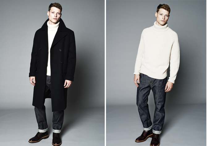 Patrick’s favourite pieces from the range include the greatcoat mentioned above and the white rugby shirt at £40 (he’s a good rugby player). My favourite pieces are the roll neck wool sweater at £40 and the Japanese-loom-woven denim jeans, a snip for the quality at £60 and check out the shirts, particularly the hairline stripe, very classy .