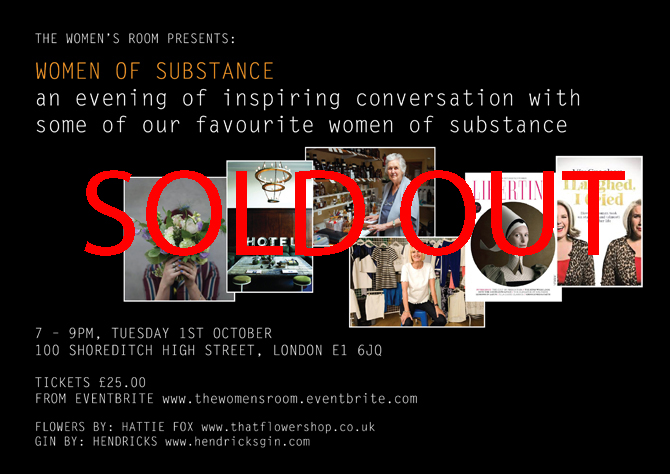 Next Tuesday is shaping up to be the best night out of the year – no pressure there then – as we are now officially sold out for our Women of Substance Salon. We are super excited/nervous and looking forward to seeing those of you who were quick enough off the mark to get tickets.