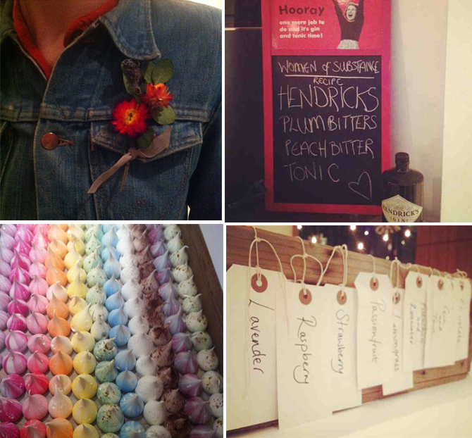 We started the evening with cocktails created by the Ace barman, using Hendricks Gin over ice, a dash of peach and plum bitters and topped up with tonic. The Meringnue Girls provided us with an array of rainbow coloured, flavoured mini meringues, while Florist Hatty Fox demonstrated how to make modern buttonholes (no carnations here).