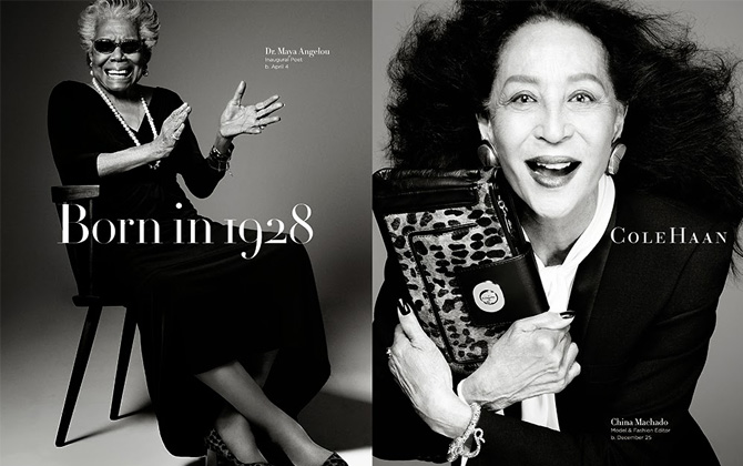US brand Cole Haan recently celebrated their 85 anniversary by creating an advertising campaign called ‘Born in 1928’. The print and digital campaign for their Autumn range, celebrates portraits of writer Maya Angelou, photographer Elliott Erwitt, astronaut Jim Lovell and model China Machado, all of whom are 85 years old.