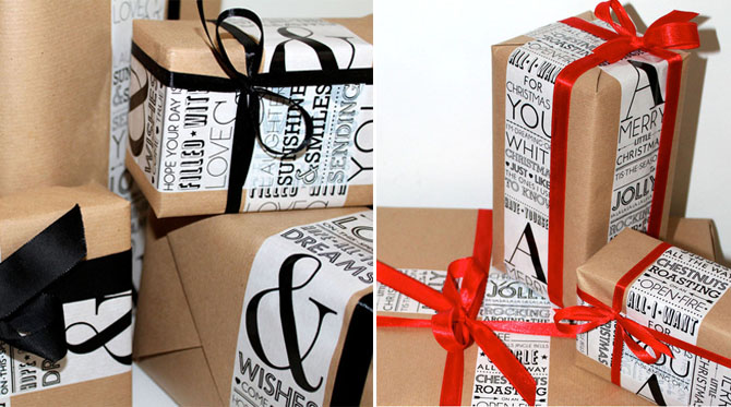 Her Christmas wrapping tape looks great with simple brown paper and red ribbon.