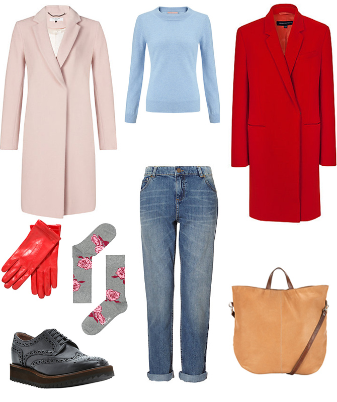 My edit includes bright red leather gloves worn with the gorgeous baby pink coat and sky blue cashmere. I added a pair of boyfriend jeans from Whistles, with chunky brogues to give the Womens Room edit more of a casual feel. Happy socks are my absolute favourite sock brand and I would roll up the jeans to reveal a cheeky pop of colour and pattern.