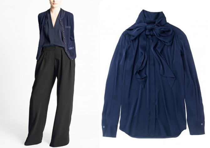 I love this type of tiny detail…another one here on the tie wrap that matched the Lauren blouse (£225), it fastens onto the shirt with buttons that disappear into the collar. I am very keen on the midnight version (top image) which looks gorgeously low-key glamour worn with the wide legged trousers (£150) in black.
