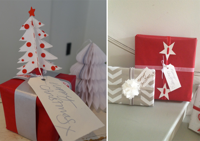 I have some black, white and grey twine/string that I’ll tie around the gifts and tuck hand written oblong labels under the twine. I’ve got a bright pink pen to write the labels with as a total contrast to the monochrome wrapping.