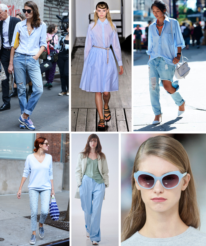 Combine a pale blue soft shirt with washed out denim for a more casual look, or add metallic silver and a slash of red, pink or orange lipstick, if you feel more daring.