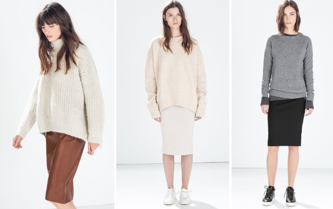 Absolutely love the top three looks from Zara. Having not worn midi length skirts for about ten years I find the bulk of the skirt difficult especially when you’re quite short like I am. The narrow skirt and big jumper works much better and looks so contemporary. I also like the Whistles look of an A-line midi and a shorter (not crop!) top – again it’s all about getting the proportions right.