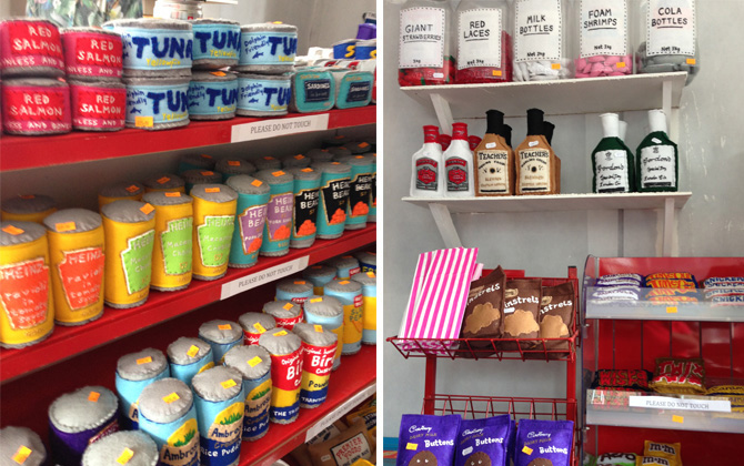 Artist Lucy Sparrow has filled a former derelict shop in Bethnal Green, just behind Columbia Road, with over 4,000 handmade felt versions of popular grocery items – from fish fingers and cans of SPAM, to sanitary towels, newspapers, ice lollies, oven chips, cigarettes and vegetables. She has even made a newspaper stand, drinks cabinet and all of the shops accessories and signs.