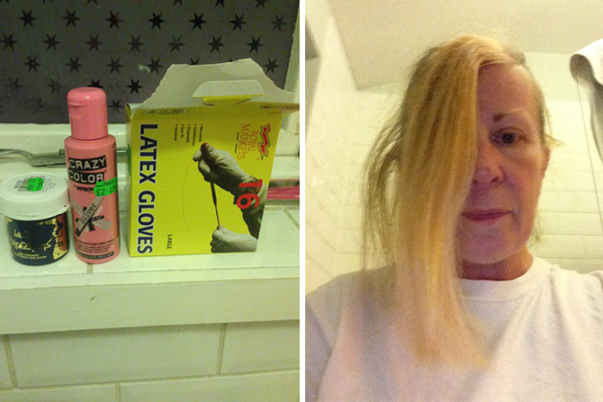 The key to the going grey the fake way, is to bleach the hell out of your hair until there is no natural colour left, which despite my many previous (punk) hair styles I have never actually done before. This dear readers for the uninitiated is scary – very scary – and who knew it hurts? Certainly not me and there was much screaming “are you sure you read the measurements right” and hideous thoughts of burnt scalps and baldness. We toyed with the idea of making a You Tube video but there was too much swearing!!