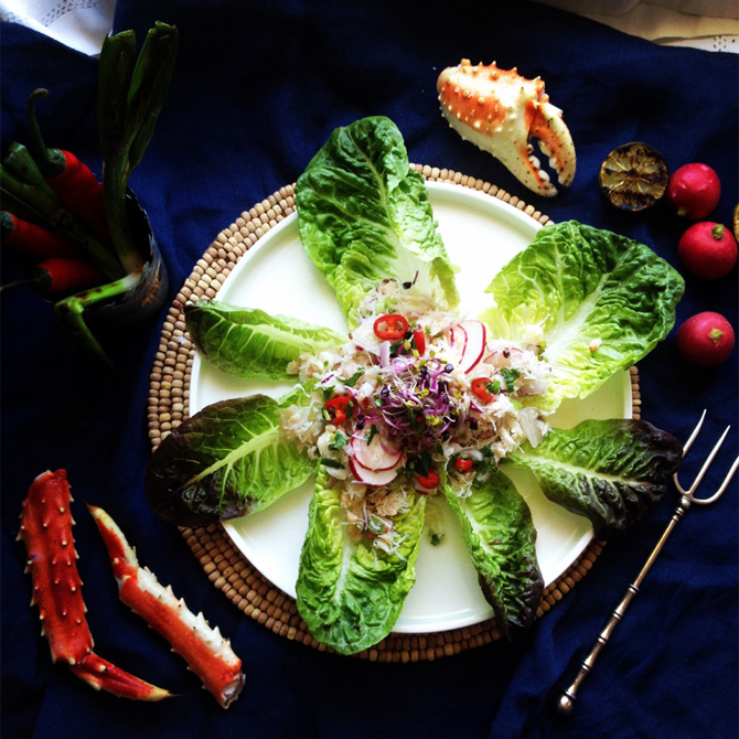 I love food’s ability to not just satisfy in the moment of eating but to set off little chain reactions of memories and associations in your mind’s eye, making the experience all the richer. I end up buying some pre-prepared crab (for ease) and several king crab legs to satisfy the kids’ desire to have a go at teasing out the sweet white flesh with toothpicks. I pad out the expensive crab meat with rounds of crisp radish and pencil-thin spring onions and serve the crab in lettuce ‘cups’. Topped with a dressing that is zingy with chilli, lime juice and fish sauce each mouthful is a fresh, crunchy and sweet delight.