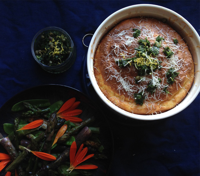 A roasted garlic and potato souffle provided the warmth and comfort against those sudden squalls, the chargrilled asparagus salad with its seasonal elderflower dressing supplied a spring crunch, and the Courgette and Pistachio Cake provided the antidote to any weather-induced grumpiness. It was a meal ready for anything the weather might dare throw at us, well, except snow! Surely we won’t have snow in late May?