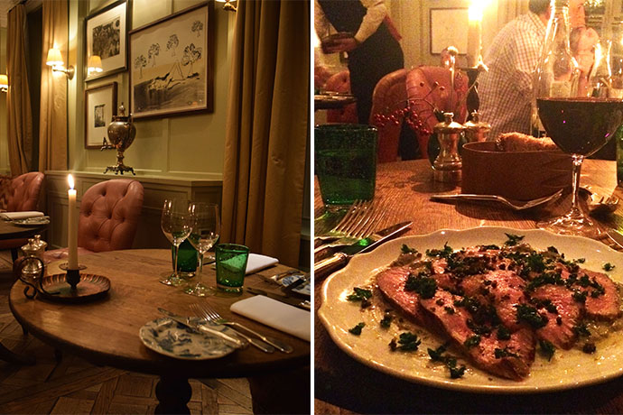 Later that night we dressed and walked through to the main hotel – resplendent in festive goodness. Seemingly choreographed for us, we watched as a tweed adorned young man pull a wicker cart up the path laden with logs and piled them on the crackling fire in the reception hall. We had dinner that night by candlelight at the fabulous Harnett and Holder whilst Aarya snoozed next to us [phew!].