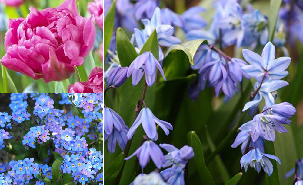 The print reminds me of a parrot tulip such as Tulipa Dior (below left). It needs a cloud of bright blue around it, so I’ll be going for the forget-me-not Myosotis sylvatica (bottom left) and some Scilla siberica (below right). It’s too late now to be planting tulip bulbs, but if you want to use tulips in your scheme you should be able to find them already planted in pots in most garden centres.