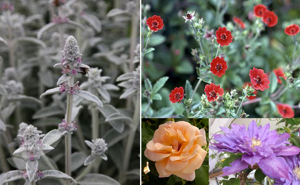 The silver in the coat could be represented by Stachys byzantinina (below left) and Potentilla cinquifolia ‘gibson’s scarlet’ (below right) could be mixed in for threads of red through the scheme. Finally for some climbers at the back of the border I’d mix Clematis Vyvyan Pennell (bottom right), with climbing rose ‘School girl’ (bottom left) reflecting the orange in the coat.