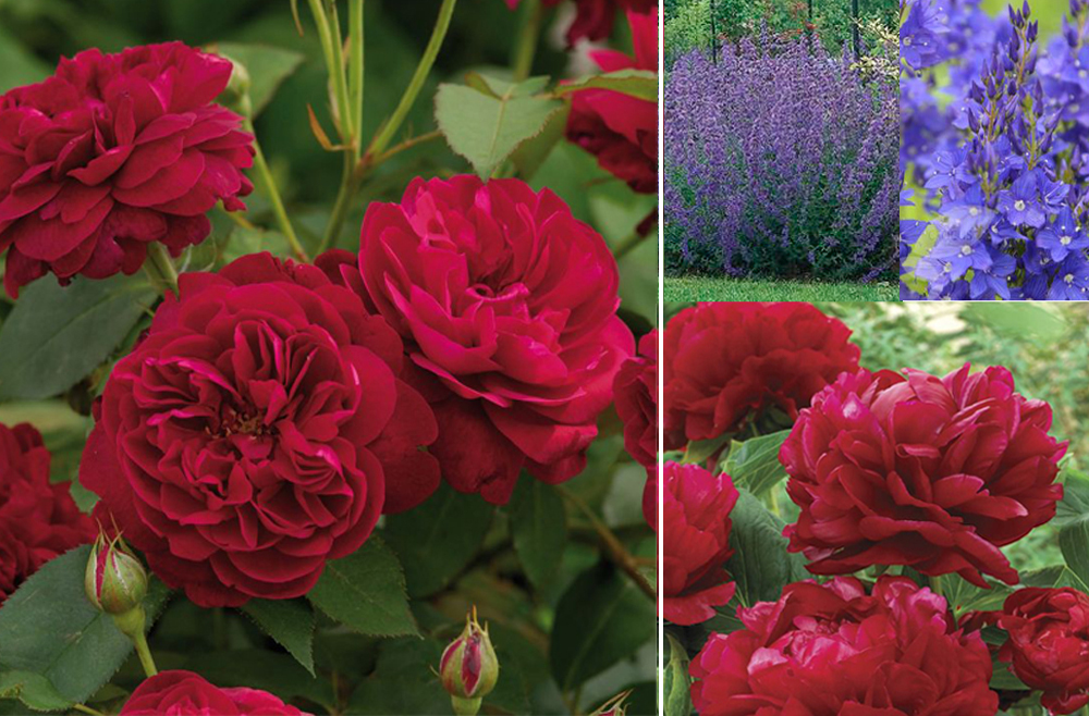 The red flowers on the coat remind me of a red peony such as ‘Henry Bockstock’ (bottom right) which will give you flowers in May/June. To extend the season you could use Rosa ‘Darcey Bussell (left below) and for the blue of the coat you could use Nepeta ‘Six Hills Giant (below middle) good for covering the bottom of the roses and supporting the rose flowers with a cloud of blue. Other blues could be provided by a Veronica such as ‘Shirley Blue’ (below top right).