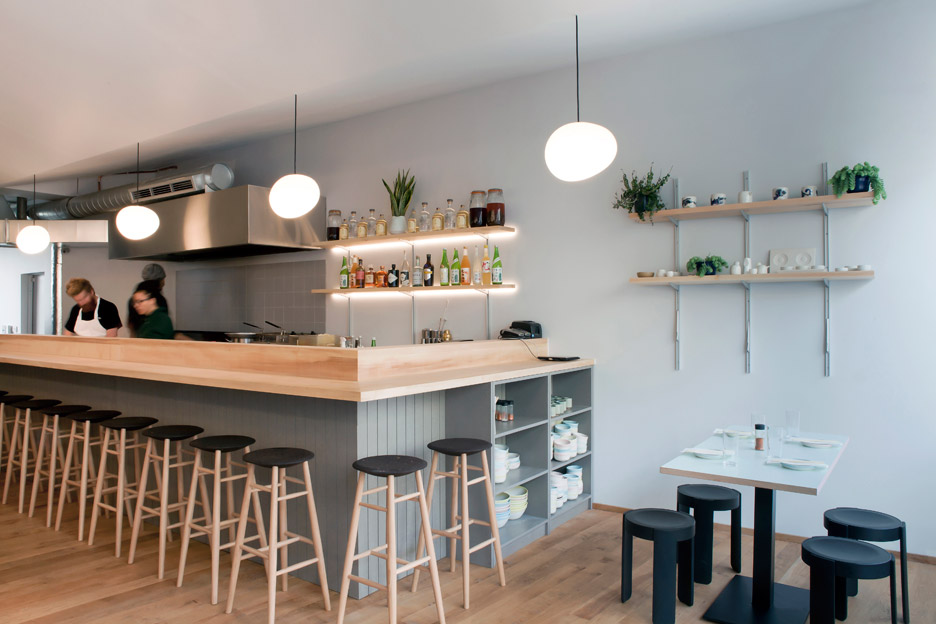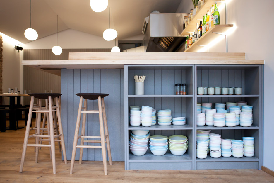 The pastel palette is complimented by bespoke crockery, designed for the restaurant by Japanese ceramicist Yuka Kikumoto.