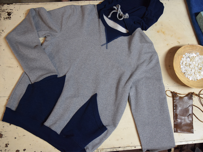 And lastly, with a nod to the athleisure trend, a hooded sweatshirt, in super-soft marled terry yarn, based on a 1930s style, with patch pockets popular in that era for sportswear. The rib at the neck and cuff are in indigo yarn, which will fade like denim. The hood is attached after the indigo fading aspect…you can take a stitch ripper to it and have just a sweatshirt.