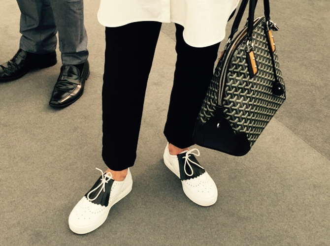 Mono – black and white or navy and white – was a really big thing, clothes-wise, at Frieze 2016, it looked particularly fabulous when a graphic print or spot was worked into the mix. Cropped wide trousers and a white shirt are anchors to this look.