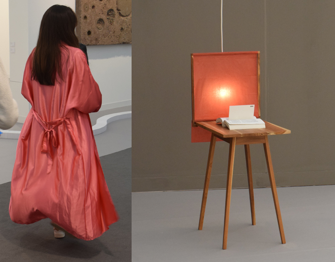 After my recent post on Maker’s House and all those silk dressing gowns, I was struck by how romantic and fluid this silk coat in pink looked, above. It moved so beautifully. And on the right, OK, so it might look like a side table with a book on it to you but it’s art, by Juan Araujo, called complimentary shadows.