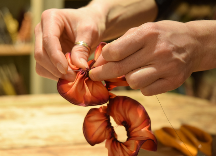 We used pre-wired ribbons that you gently pulled and cajole into the right shape, pinning and lightly sewing to anchor the rose.